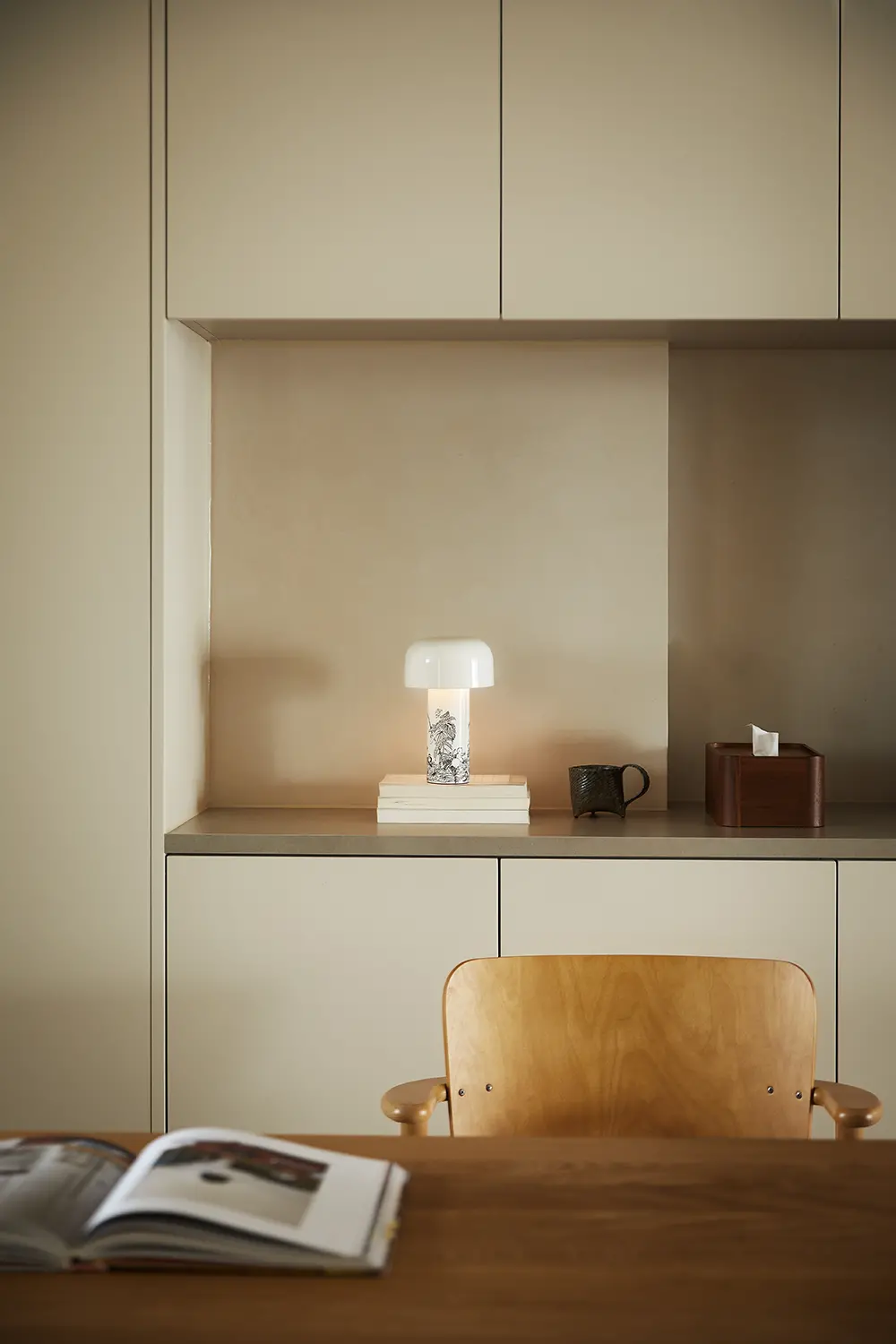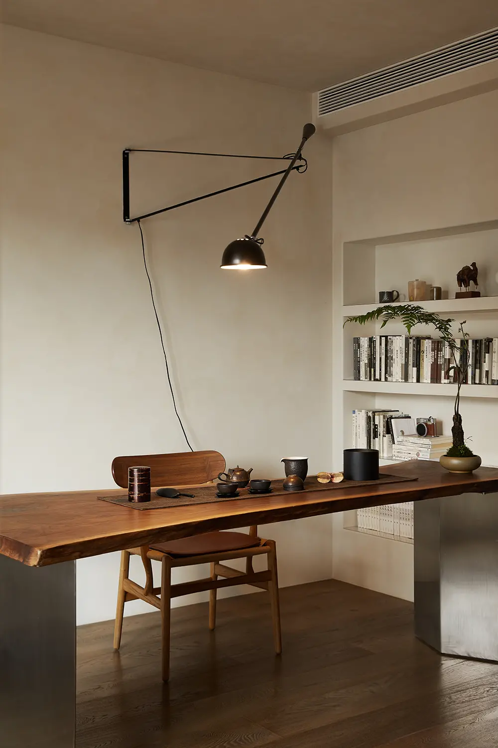 Behind the sofa is the study area, and the wide solid wood desk can meet the needs of male and female hosts working, studying or drinking tea and leisure at the same time.
