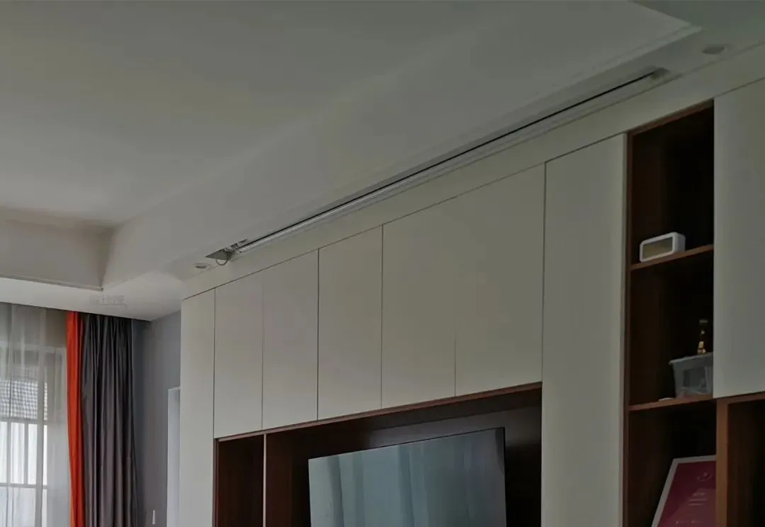 If you plan to install a projector, you can reserve a curtain slot in advance when suspending the ceiling. In this way, the curtain can be completely hidden in the ceiling, put down when needed and put away when not needed, so that the space can be kept simple and unified at all times. Similarly, other equipment such as audio and fresh air outlets can also be considered to adopt hidden design.