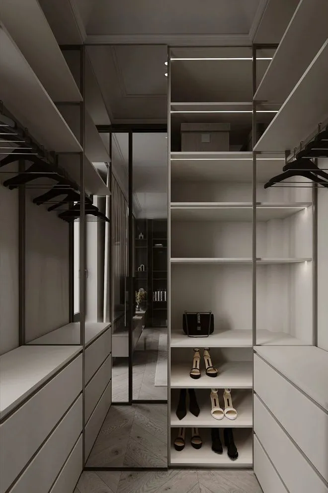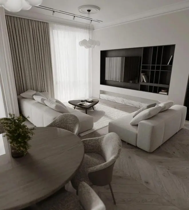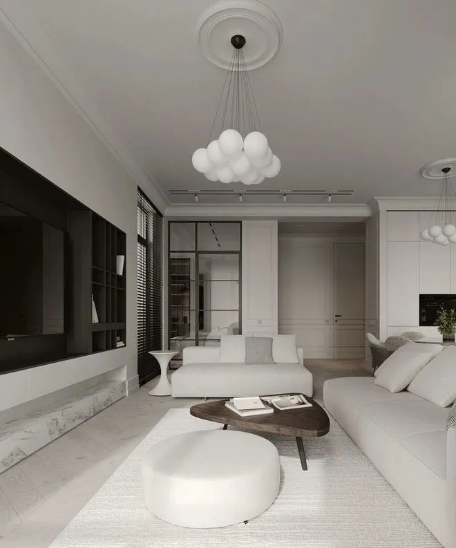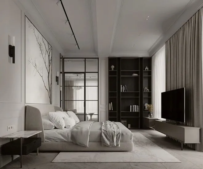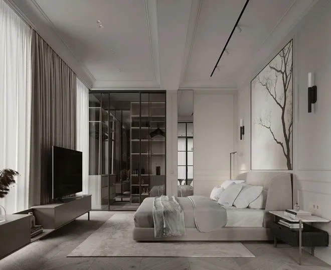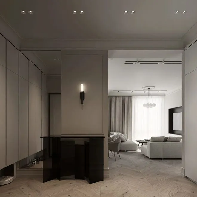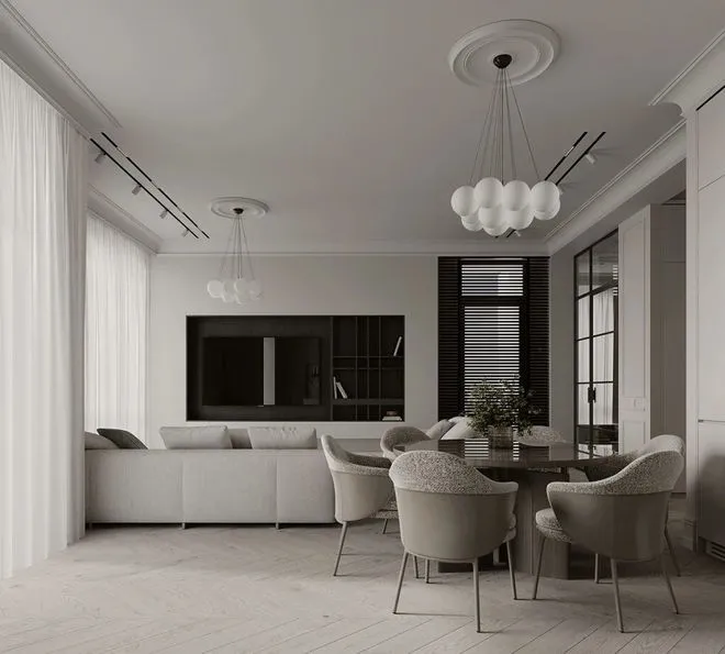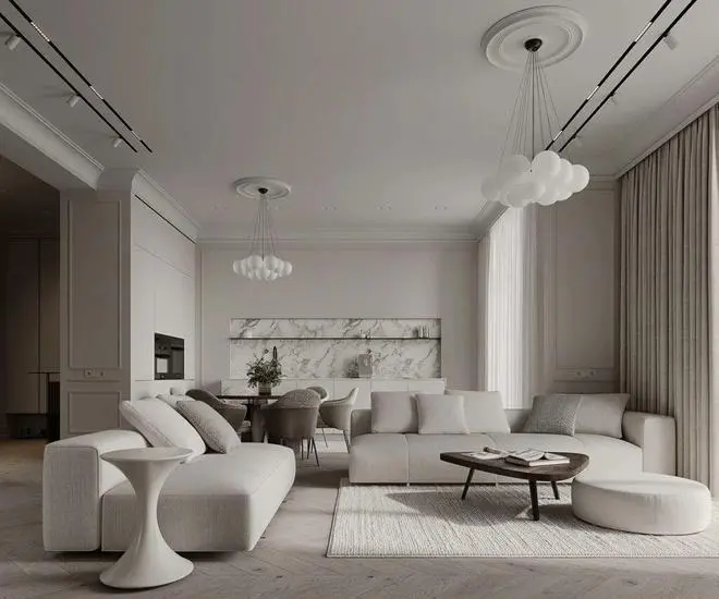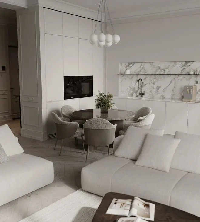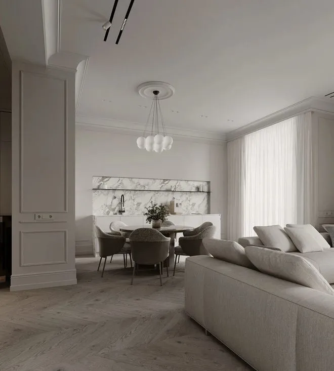 The neoclassical style apartment gives people a light, transparent and classic feeling. The whole space is dominated by light neutral tones, and the neat and clean lines give it a modern flavor. Through delicate moldings and smooth stone surfaces, it adds a rich visual layer to the space. The spacious windows allow natural light to fully influx in, reflecting the texture of marble and clear architectural details, creating an atmosphere that is both atmospheric and peaceful.