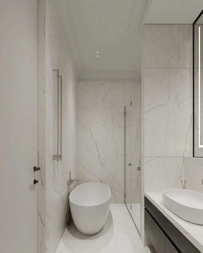 Although the bathroom space is compact, it is open and bright through the use of marble materials. Freestanding bathtubs and on-top basins add luxury, while dark wood planks provide a stark contrast. The rectangular mirror with a sleek LED strip provides a unique lighting effect. The toilets are separately separated with glass partitions, ensuring the privacy of use.