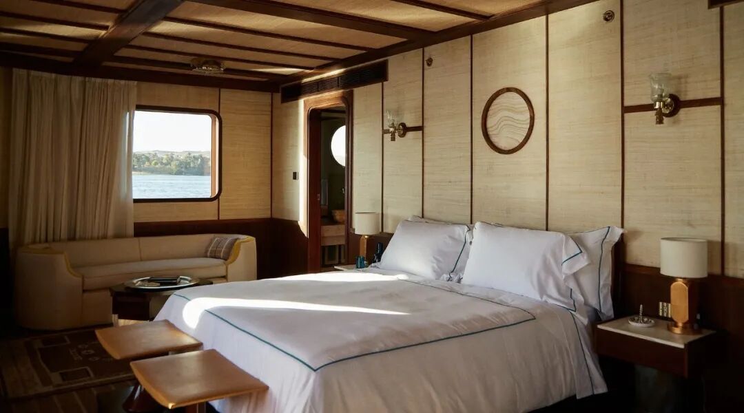 The ship accommodates up to 12 guests and features four double cabins and two suites. What’s special is that all cabins are located below the waterline, so you’ll wake up with a view level with the Nile. In the days of the Pharaohs, it was believed that ships could carry light across the sky and bring the gods to earth. Staying here seems to have experienced such a sacred journey.
