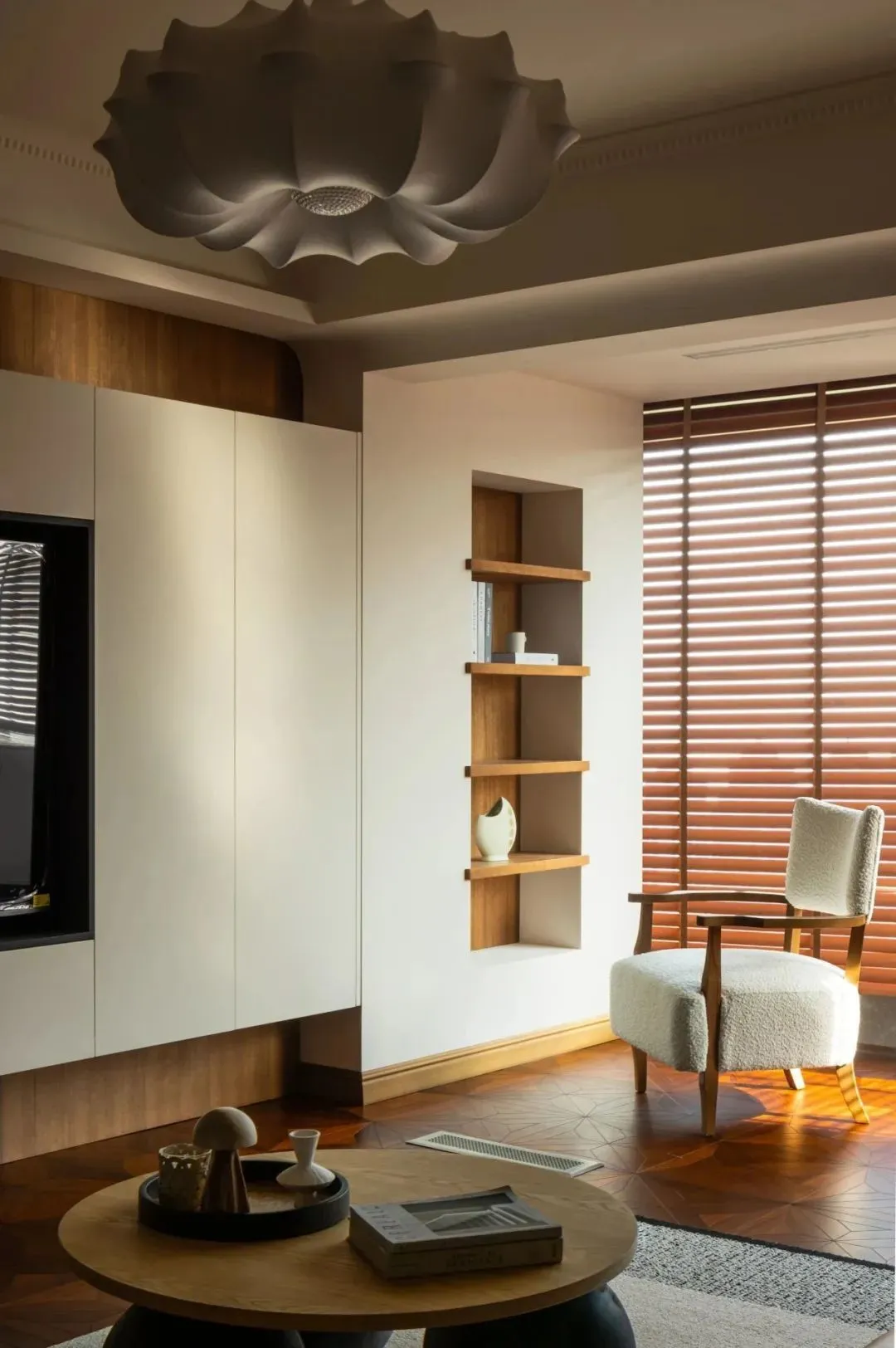 A set of sideboards is customized by using the beam structure, which can not only meet the storage needs, but also play the role of space partition. In the four-section layout, the combination of rock slab and log materials shows the diverse aesthetic feeling of the space.