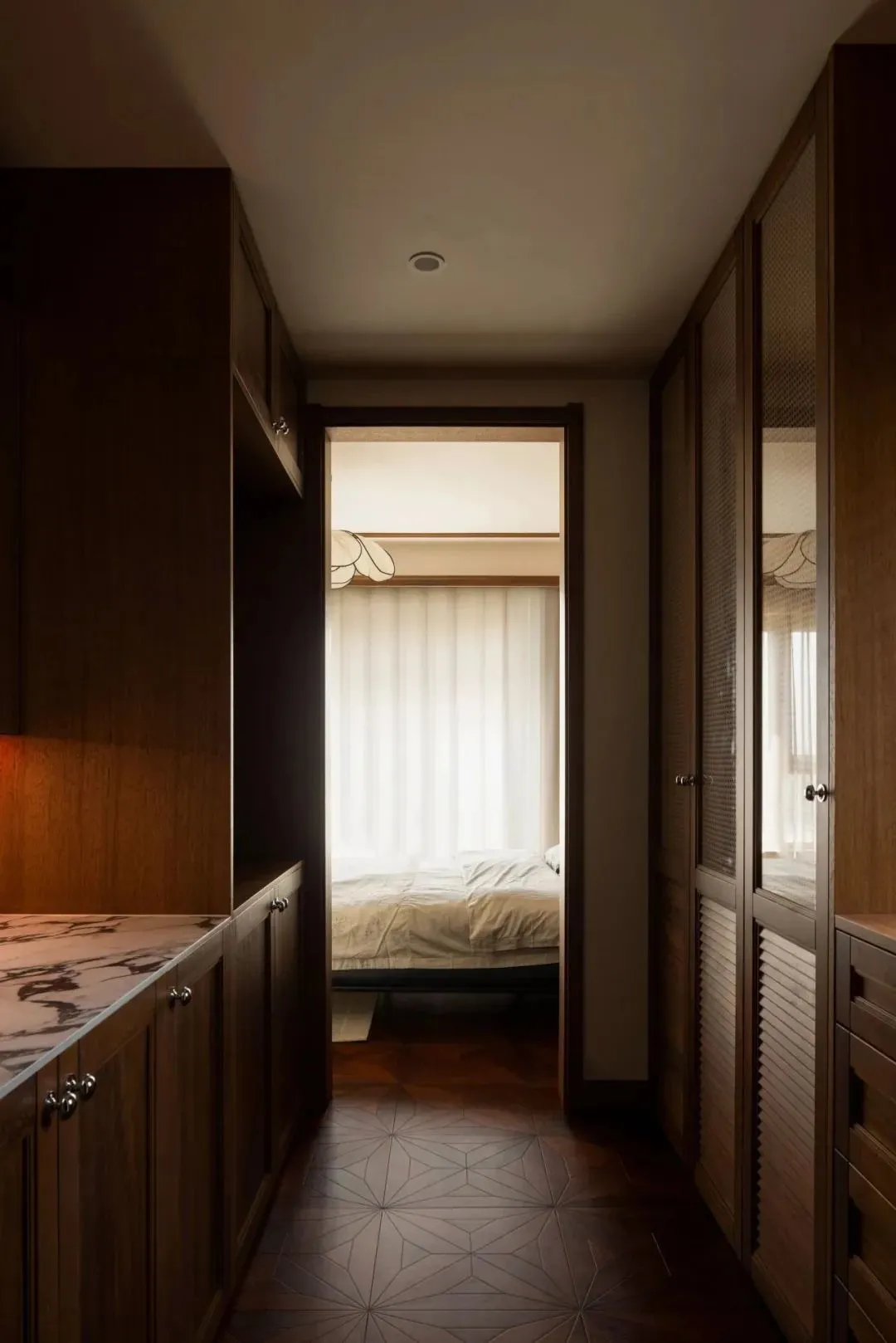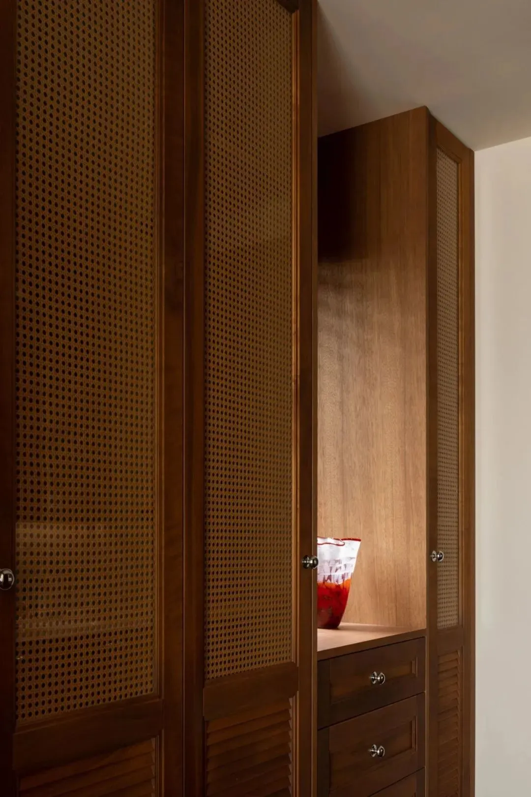 In the aisle between the master bedroom and the main bathroom, two groups of cabinets are customized to form a walk-in cloakroom, which fully meets the storage needs. The whole wall cabinet door combines retro logs, rattan, louvers and glass elements, which improves the storage aesthetics of the space.