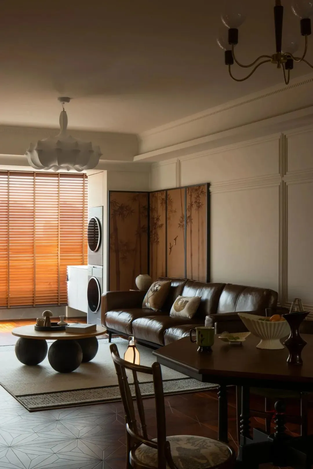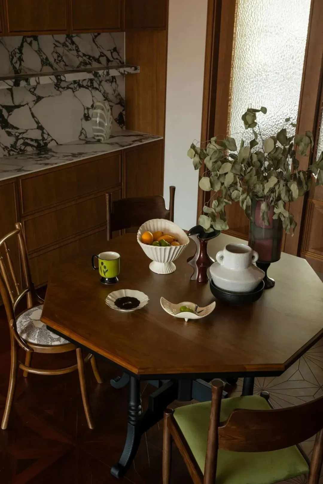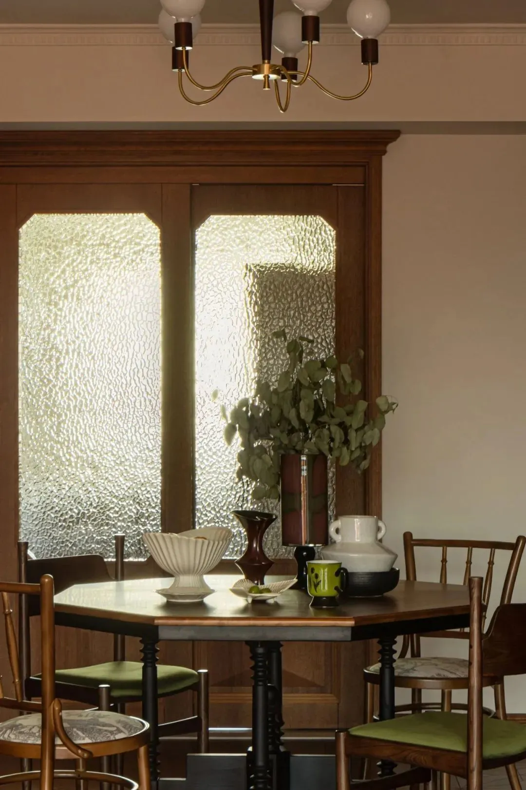 The vintage cherry wood octagonal table, with black Roman column legs, reveals a calm medieval charm. A brass magic bean chandelier echoes the solid wood dining table-this world is not reserved to the outside world, but only prepared for family reunion.