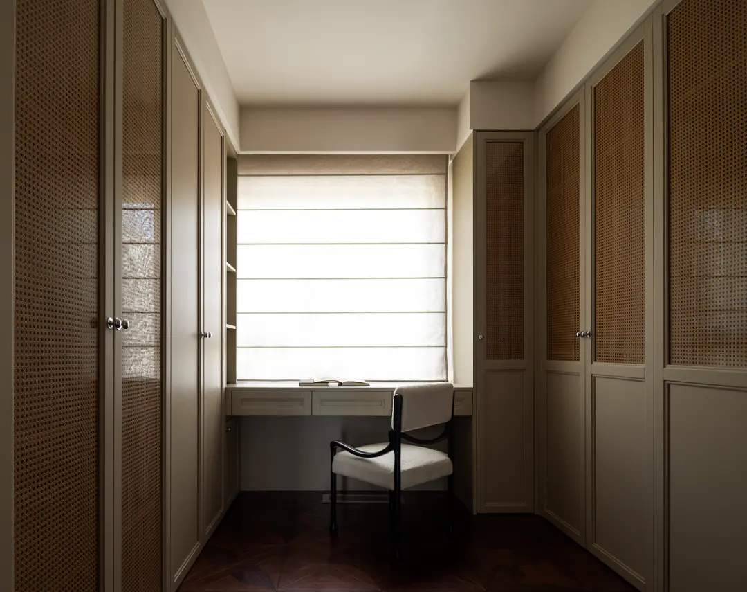 The second bedroom was transformed into a study room, and the whole wall storage cabinets were customized on both sides of the walls. The cabinet door combined with glass rattan not only exudes a natural and simple atmosphere, but also is not easy to accumulate dust and is easy to take care of.