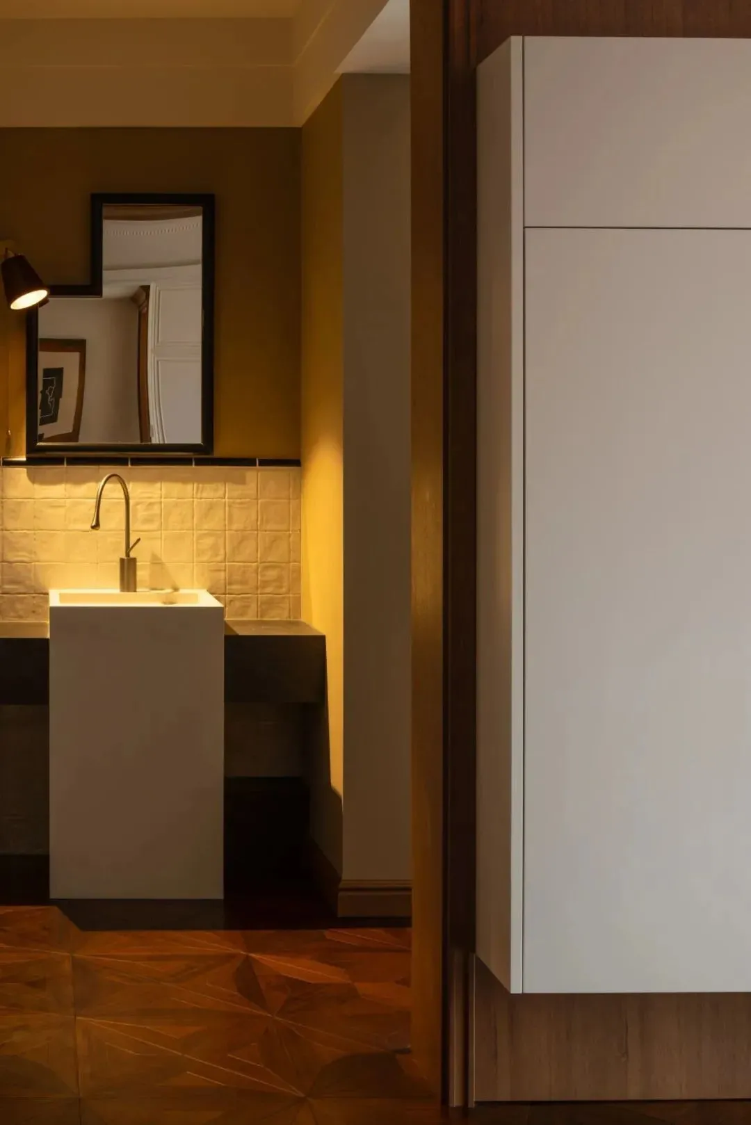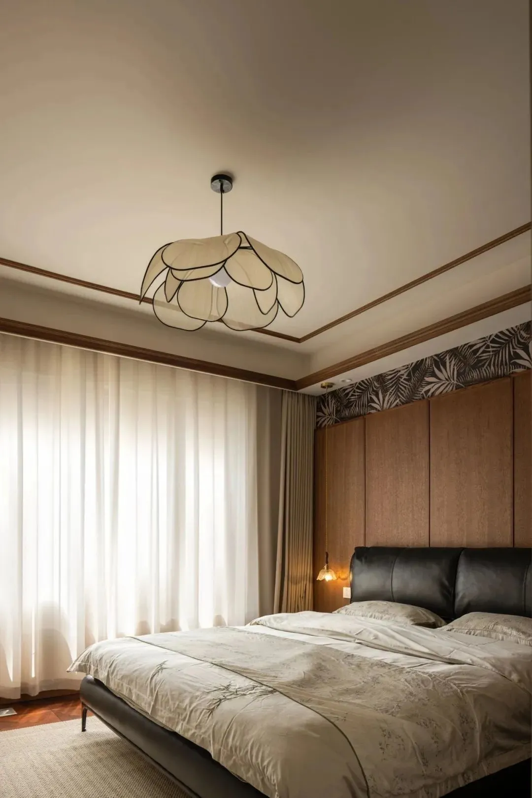 The bedroom continues the overall medieval tone. With mottled palm leaf wall covering as the background and wooden wainscoting, the simple and elegant furnishings are like slowly flowing clear water, gently infiltrating dreams. It seems that you can smell the sweetness of rice in the space, which makes people gradually relax and yearn for it. The rich autumn atmosphere quietly pervades here.