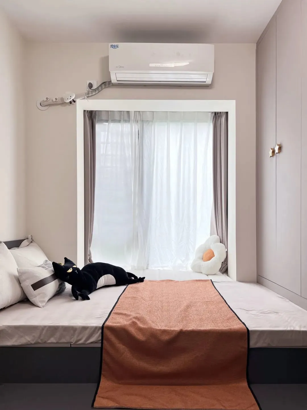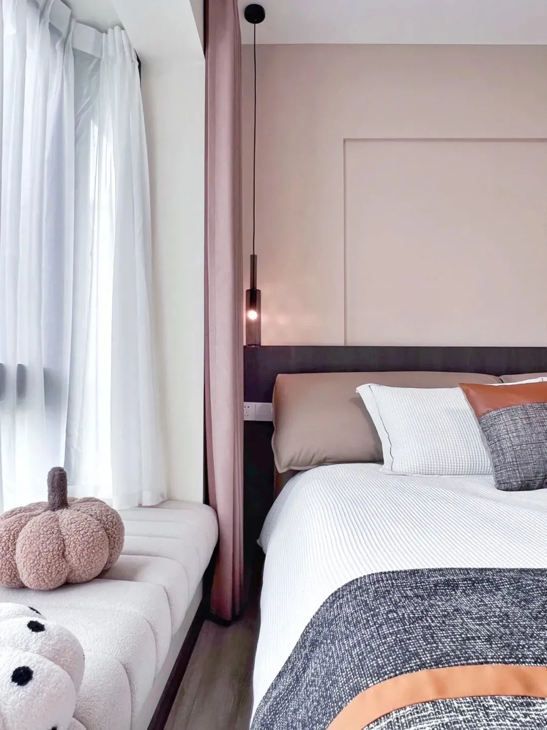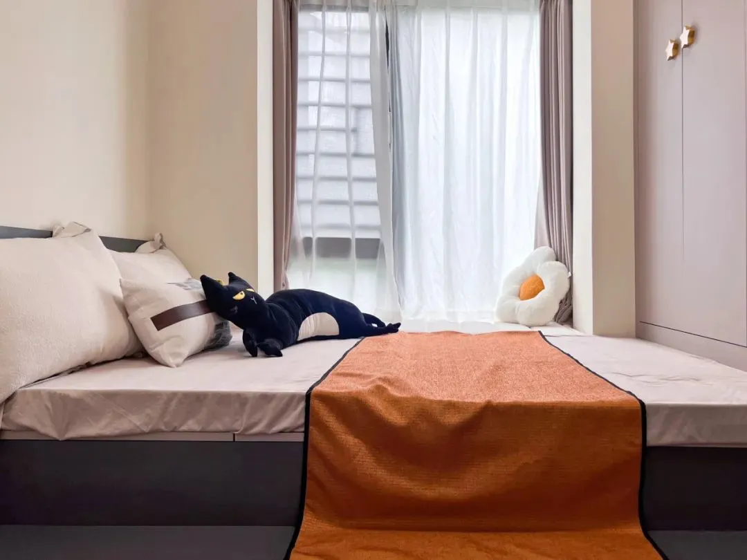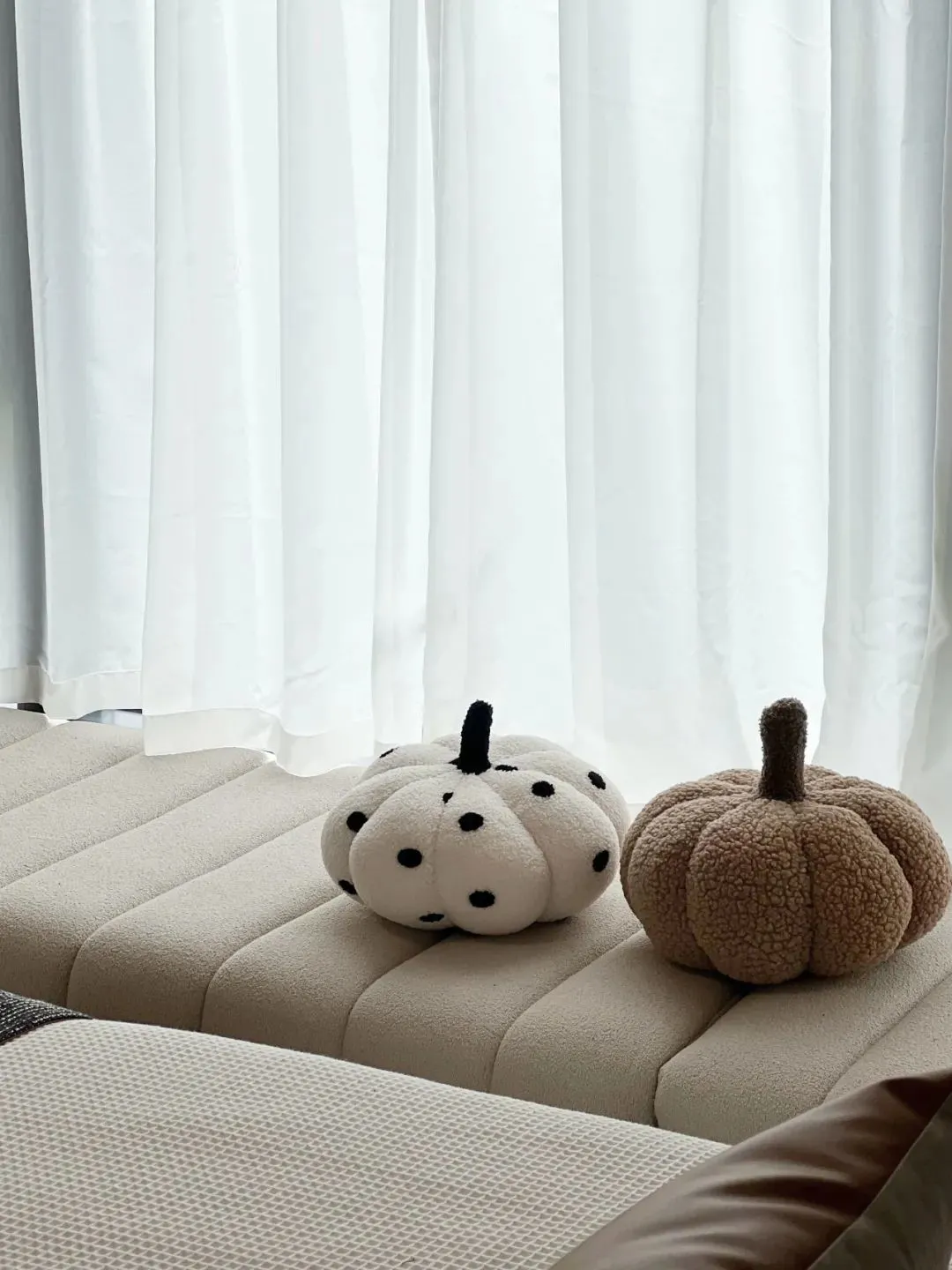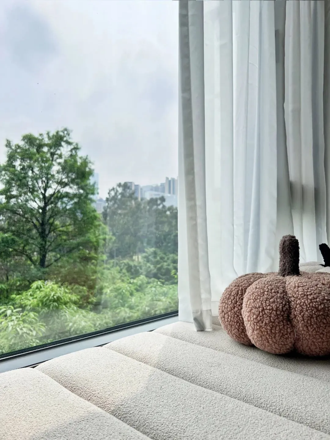 The bedroom is designed with bay windows, covered with thick and soft cushions, and placed with cute pumpkin dolls, which makes me feel healed. Thin white gauze curtains ensure lighting and privacy.