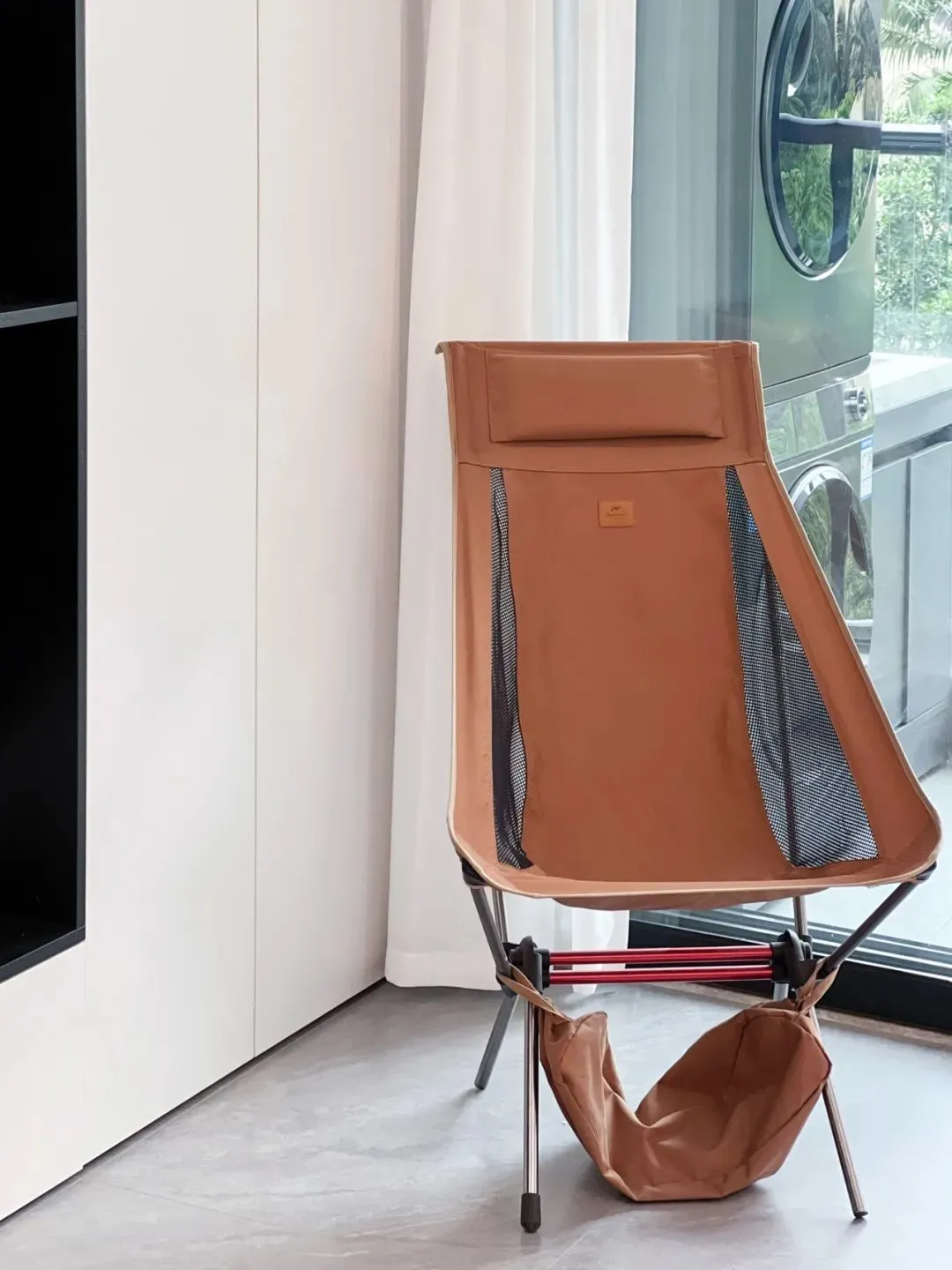 The orange-brown leather sofa is simple and elegant, and the comfortable sitting feeling can relieve the fatigue after work. Warm-colored lighting sprinkles on the sofa to create a welcoming atmosphere. The corner is matched with an outdoor folding chair in tone-on-tone, which can be stowed when not in use to save space.
