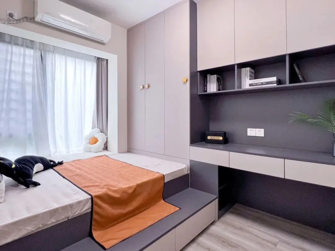 The bed, desk and wardrobe are customized in one piece, and the beige and gray colors match naturally. Custom cabinets provide ample storage space, and even hidden drawers are designed under the stairs.