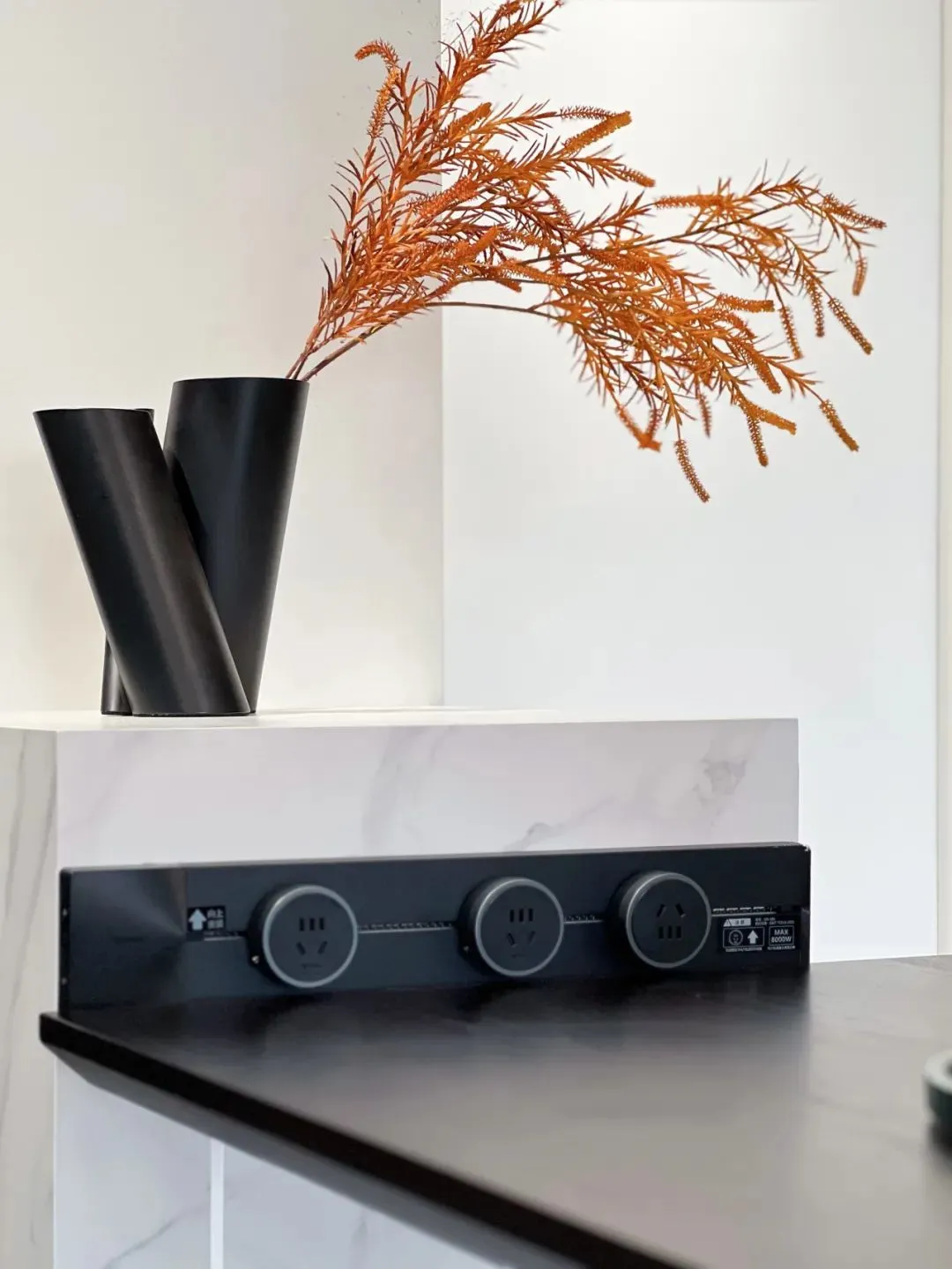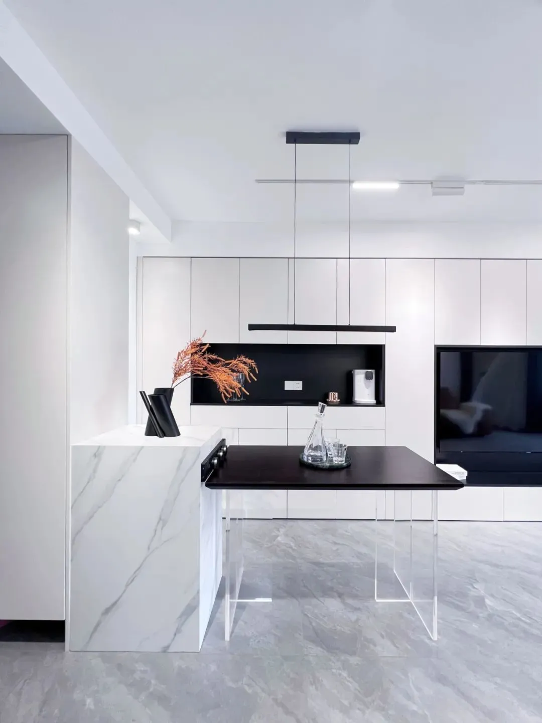 Across the porch is the restaurant, and the elegant white marble island platform connects the porch and the restaurant. The hostess loves flowers, and the island platform is dedicated to displaying floral arrangements, echoing the green plants on the balcony. The dining table has a black solid wood top with acrylic legs to create a suspended visual effect. Track sockets are installed on the edge of the table that meets the island platform, which is very practical.