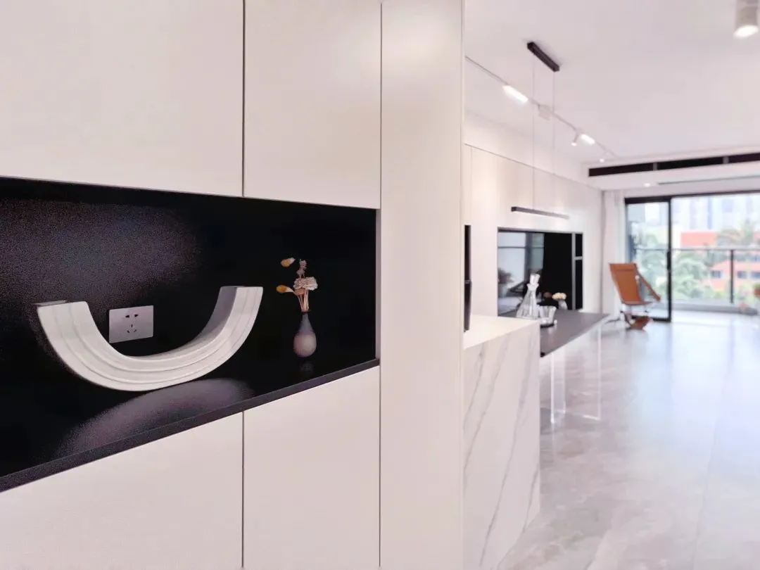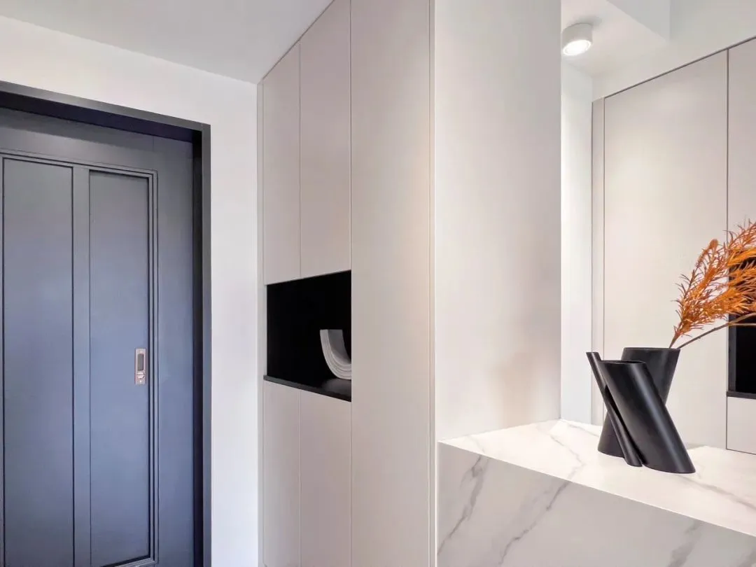 On the left side of the entrance, a top-through entrance cabinet is customized, which adopts classic black and white color scheme, with neat lines and overall simplicity and elegance. The cabinet is divided into four functional areas through black concave hollows: the lower part is used as a shoe cabinet, the middle open compartment can be used for decorations or handy objects, and the upper and right door to the top parts are used for storage, which is convenient for hanging large clothes such as coats.