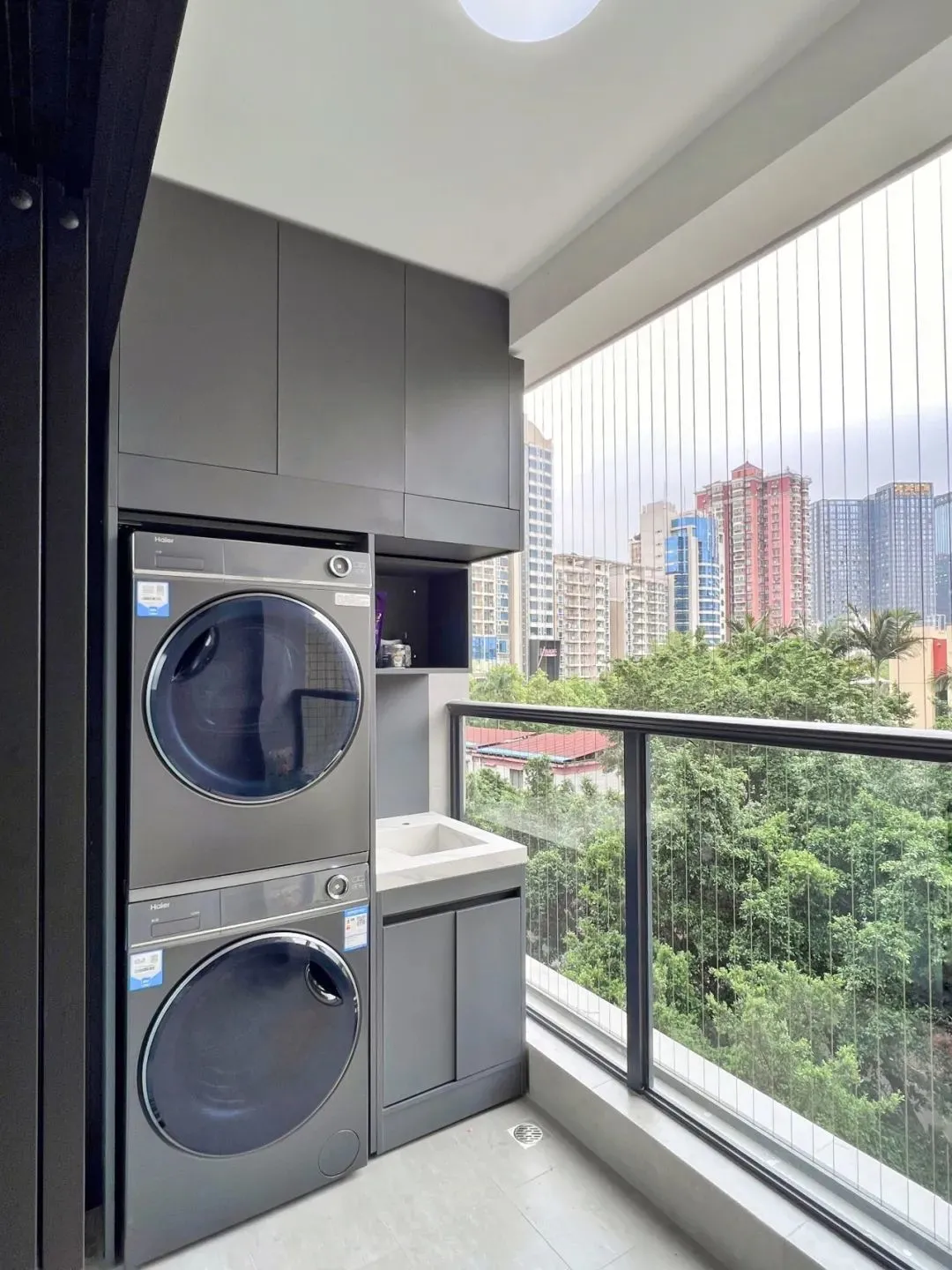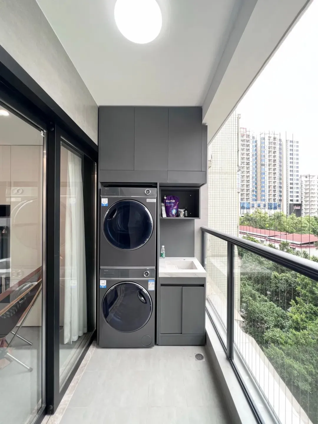 On the other side of the balcony, there is a sink and laundry area, where daily washing and drying are completed. The upper hanging cabinet can be used to store infrequently used items.