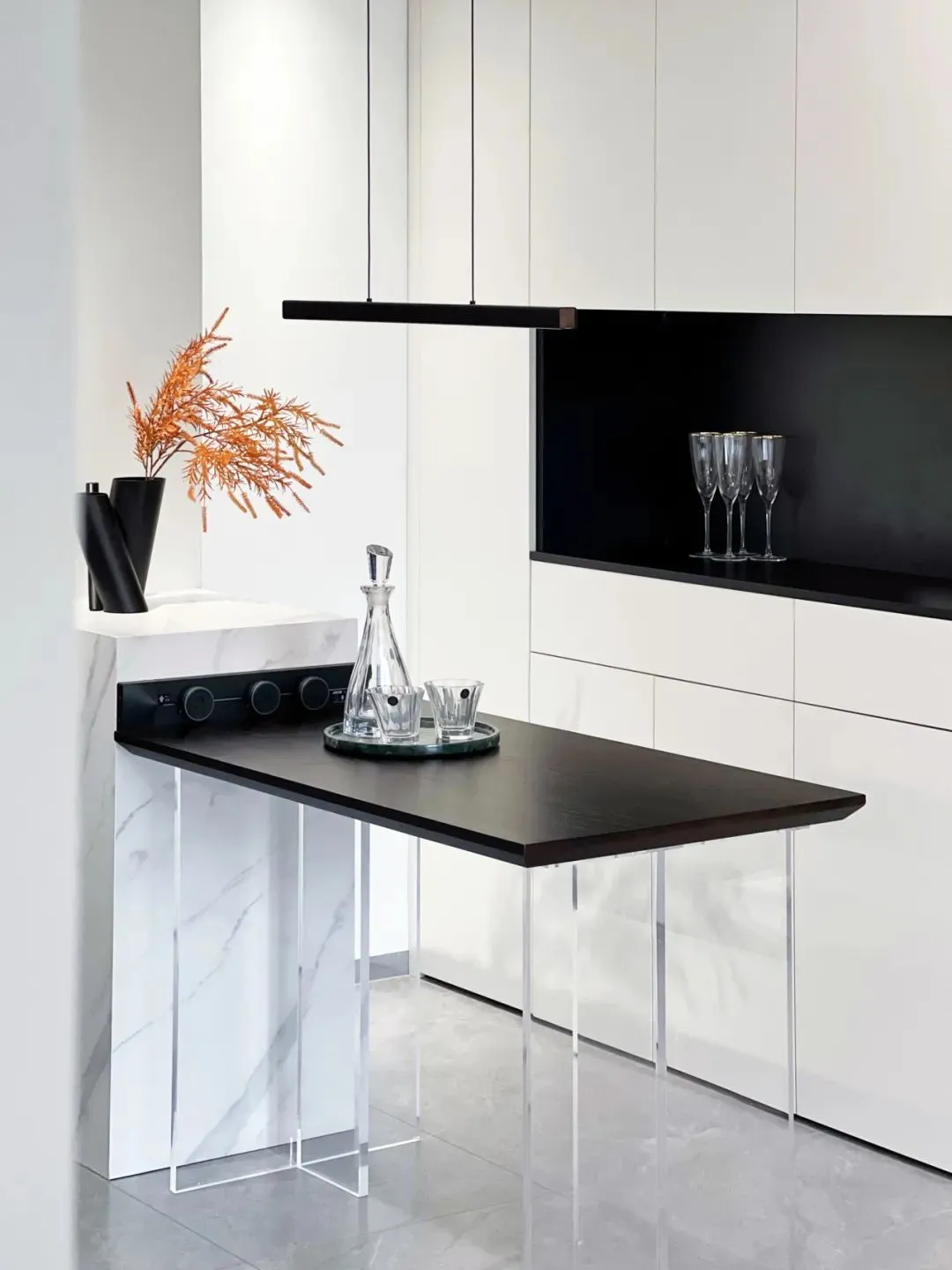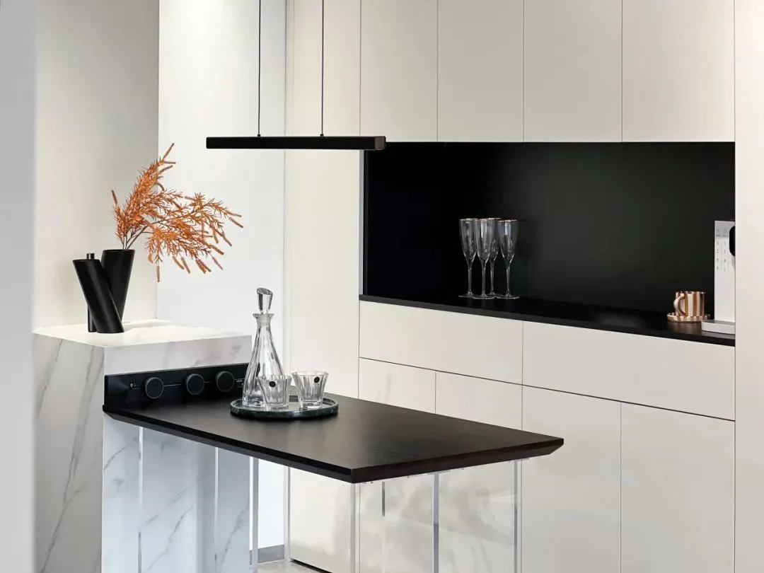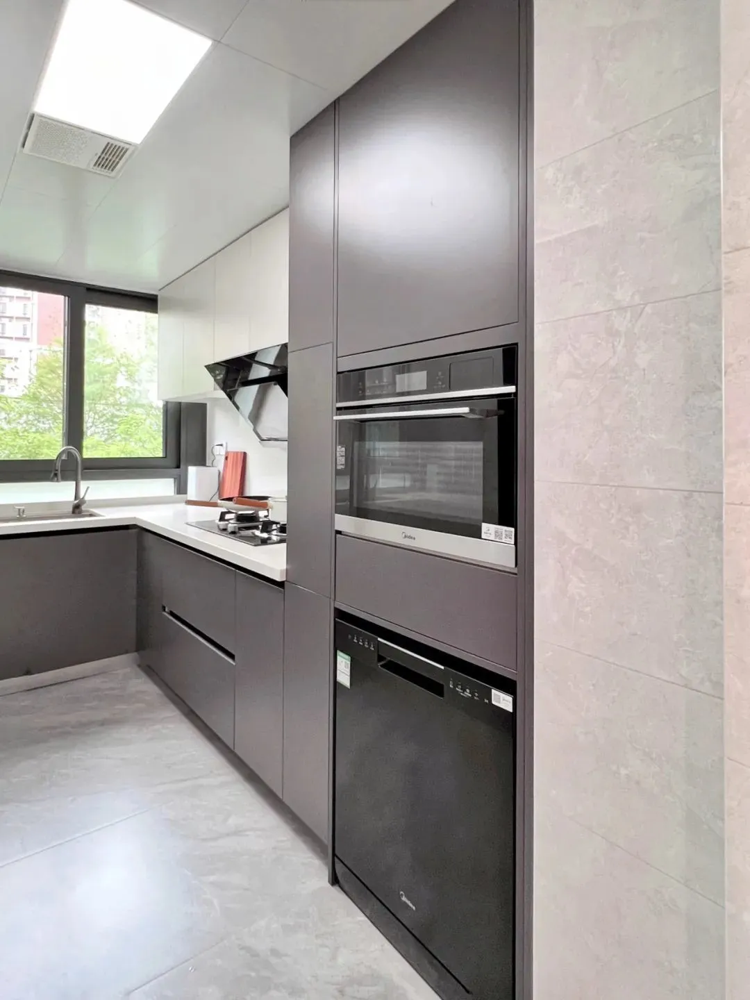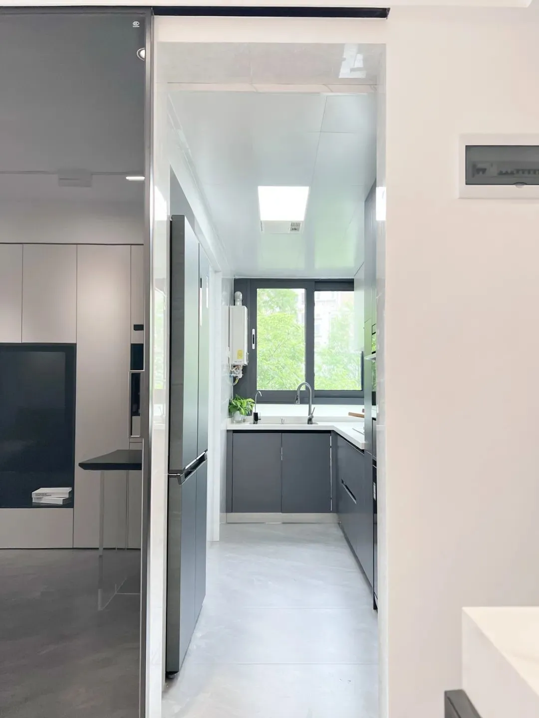 The kitchen adopts upper sliding door, which is simple, space-saving and easy to clean. The black glass has a mirror effect, which visually expands the sense of space.