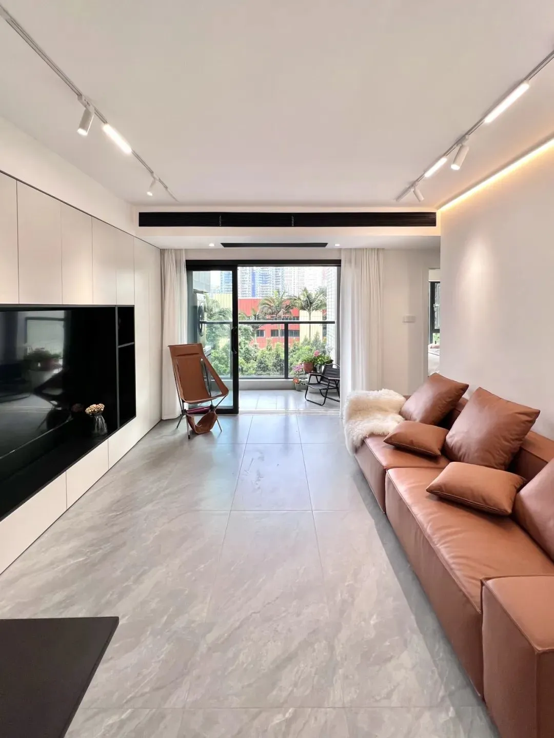 ⭐ After the renovation: the design without main lamp is adopted, and the balcony is incorporated into the living room, which improves the overall lighting and makes the space appear open and bright. The TV wall is customized with a whole wall storage cabinet without handles, which is visually simple and powerful.