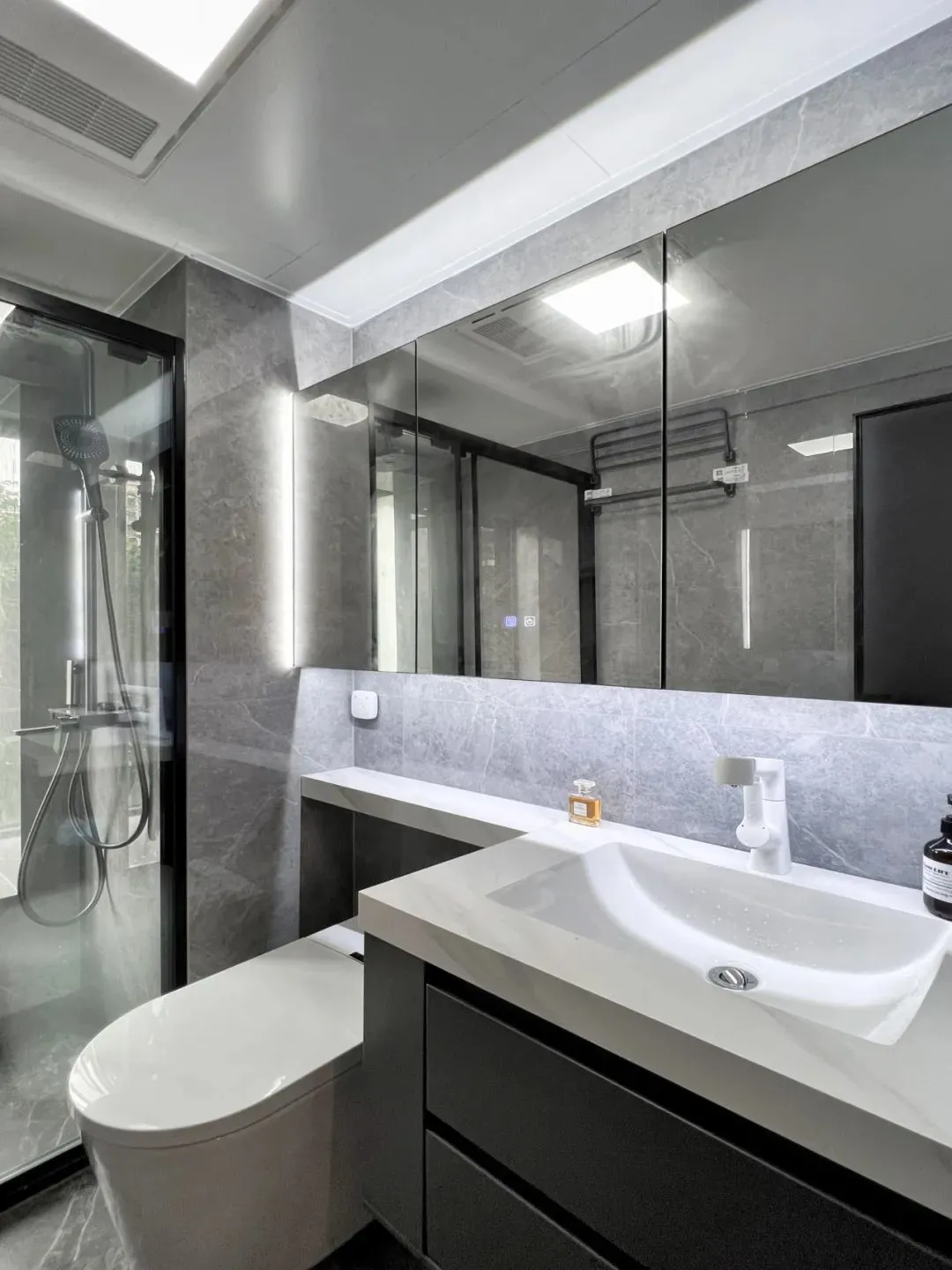 The sink adopts a white pull-out faucet and marble countertop, which is visually integrated. The multi-faceted mirror cabinet not only increases storage, but also visually expands the sense of space.