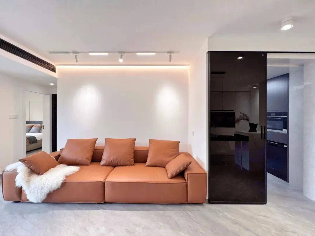 In order to keep the floor height, there is no ceiling in the living room, and two white magnetic track lamps and wall washing lamp strips are directly installed on the ceiling, which shows the sense of design.