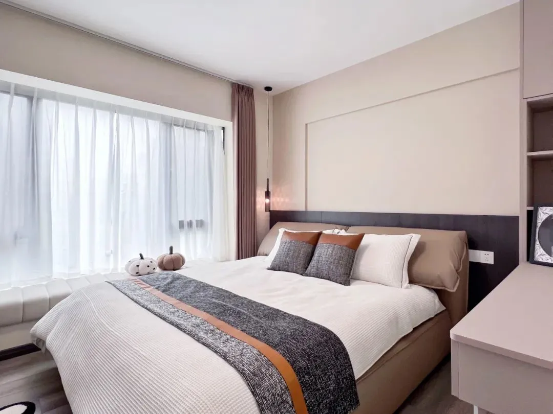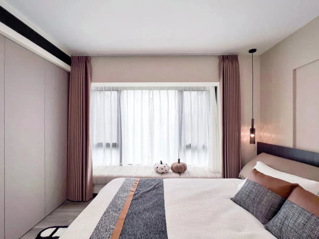 The walls are painted with apricot latex paint, which is harmonious with the dark coffee curtains. The light coffee soft-wrapped bedhead adopts an inclined design for easy leaning on.