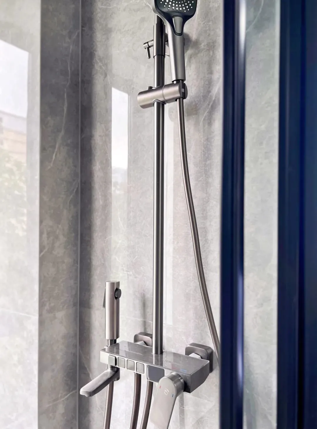 The bathroom area is limited, and the shower area uses Changhong glass sliding door for wet and dry separation. It is equipped with a multi-functional shower head, which is practical and advanced.
